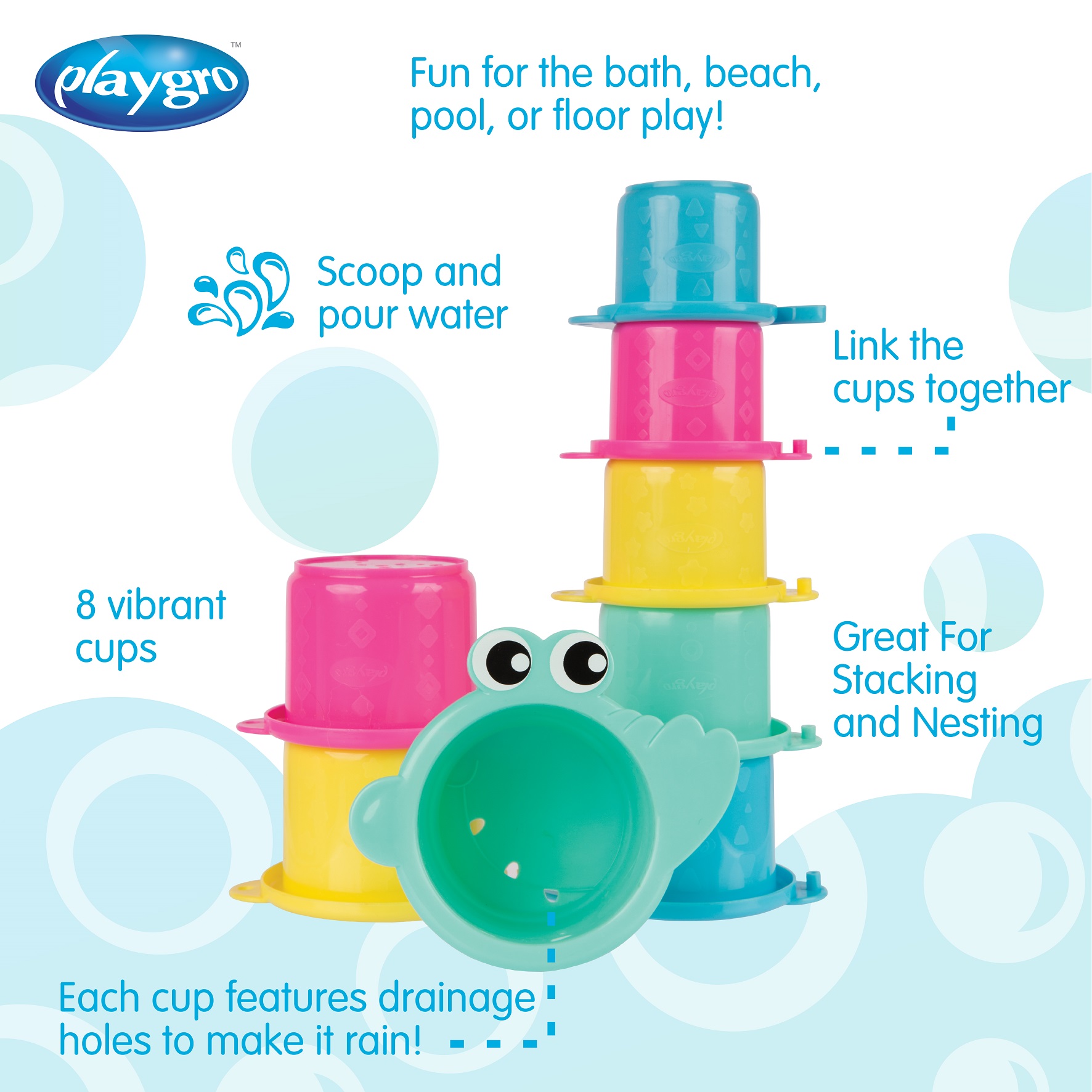Stack them up and knock them down! Little ones will be entertained for hours with these great stacking cups; perfect for the bath, in the pool, beach or general play time. There are 8 brightly coloured stacking cups, and each cup has a different shape embossed on the top, great for promoting baby's motor skills, hand-eye coordination and cognitive thinking.