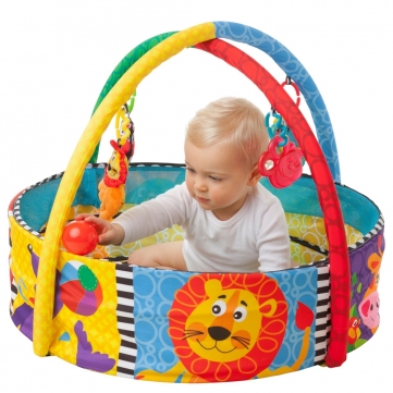 Bombs away! The Ball Activity Nest grows and advances with baby through 5 super fun modes of play from 0 months . There are 32 colourful balls that can be secured around the edge of the gym or left loose for ball pit play. Four engaging hanging toys include a water-filled teether that can be cooled in the fridge to soothe sore gums, a cute mirror for learning reflections and two soft plush characters. All removable hanging toys can conveniently attach to prams, strollers or capsules for fun on the go.